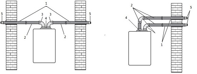 Раздельная система дымоудаления представляет собой два отдельных канала — для подачи воздуха на горение и для удаления продуктов сгорания. Для монтажа к настенному котлу используется специальный адаптер перехода с коаксиальной системы на раздельную. Подобная конструкция позволяет не только увеличить допустимую длину дымохода, но и благодаря возможности организовать вывод каналов в разных частях дома, значительно расширяется область технических решений. Зачастую так же снижается и стоимость монтажа дымохода, например вертикальный вывод через кровлю раздельной системы 80 мм. обойдется значительно дешевле коаксиального прохода через крышу 60/100.