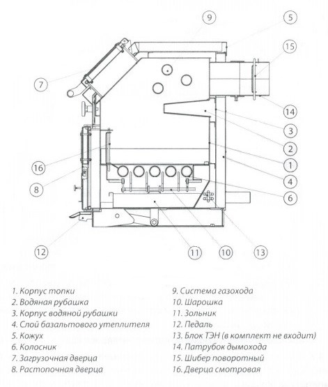 С помощью педали, выведенной наружу, удобно очищать колосники от забившейся золы во время работы котла. Образующаяся зола после встряхивания попадает в зольный ящик, тем самым нормализуя поддув воздуха в котле. При установке датчика тяги (датчик тяги не входит в комплект поставки) возможно регулировать интенсивность горения в автоматическом режиме по температуре.Туннель для загрузки топлива диагональю 370 мм, позволяет комфортно загружать сыпучее топливо при помощи обыкновенного ведра или лопаты. Диаметр выходного патрубка дает возможность монтировать стандартный (150 мм) дымоход без переходников. При необходимости твердотопливный котел Адмирал 20 может работать на другом виде топлива — в конструкции предусмотрено место под установку ТЭН и газо-горелочного устройства (дополнительные опции).Рабочее давление до 2,5 атмосфер. Теплоизоляция корпуса обеспечивает безопасность и увеличивает КПД котла.