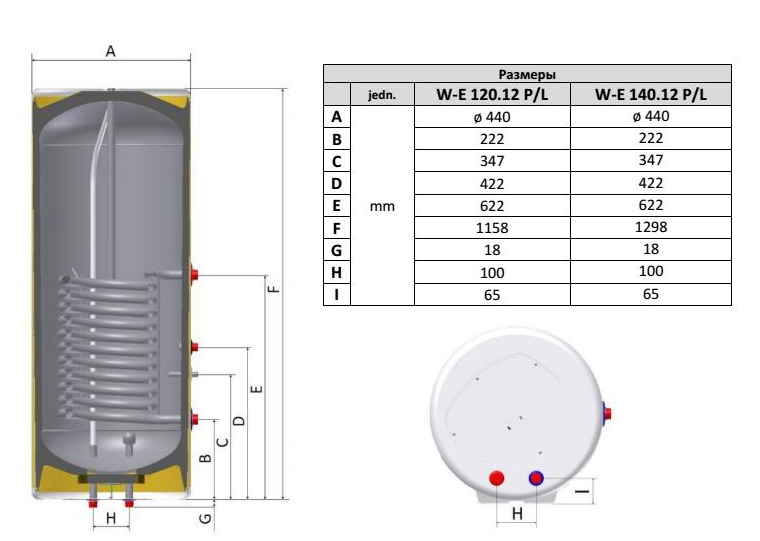 Водонагреватель BIAWAR SPIRO W-E 140.12 L/P является оборудованием, которое работает под давлением.Подключение резьбовых отверстий змеевика возможно как с правой стороны (обозначение буквой Р), так и слева (обозначение буквой L).Главная часть водонагревателя это емкость в которой находится вода . Эта емкость изготовлена из высококачественной стали и защищена от коррозии керамической эмалью и магниевым анодом. Снаружи водонагреватель помещен в металлическую обшивку, защищенной от коррозии порошковой краской. Дополнительно водонагреватель оборудован термометром, резьбовым отверстием для подключения рециркуляции, а так же гнездом (гильзой) для подключения датчика температуры.Имеется возможность подключение нагревательного элемента мощностью 2000 Ватт с терморегулятором и возможностью регулировки температуры воды от 30 do 80 °C.Водонагреватель поставляется с предохранительным краном ZB 4 со встроенным обратным клапаном, задача которого защита от высокого давления в баке. Давление открытия клапана безопасности 6,7±0,3 bar.