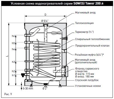 Бойлера косвенного нагрева серии SGW(S) Tower способны обеспечить достаточно большие запасы горячей воды при значительном ее потреблении. С помощью очень мощного теплообменника такие бойлера производят нагрев воды в кратчайшие сроки, гарантируя ее наличие для использования водозависимых объектов через потребление в нескольких точках отбора одновременно. Для эффективной работы теплообменника следует обеспечить необходимый уровень циркуляции теплоносителя в контуре ЦО с помощью дополнительного циркуляционного насоса и группы автоматики контроля параметров теплоносителя. Бойлер (водонагреватель) косвенного нагрева Galmet Tower SGW(S) 200 л предназначен для работы с напольными и настенными газовыми котлами, электрическими, котлами отопления на твердом топливе, а также жидкотопливными отопительными котлами любых моделей. Датчик термостата размещен в самом водонагревателе.Есть возможность подключения ТЭНа.
